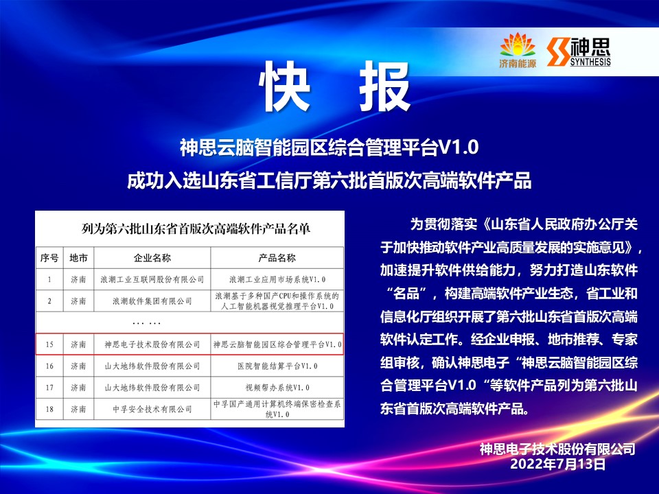 神思云腦智能園區(qū)綜合管理平臺V1.0成功入選山東省工信廳第六批首版次高端軟件產(chǎn)品