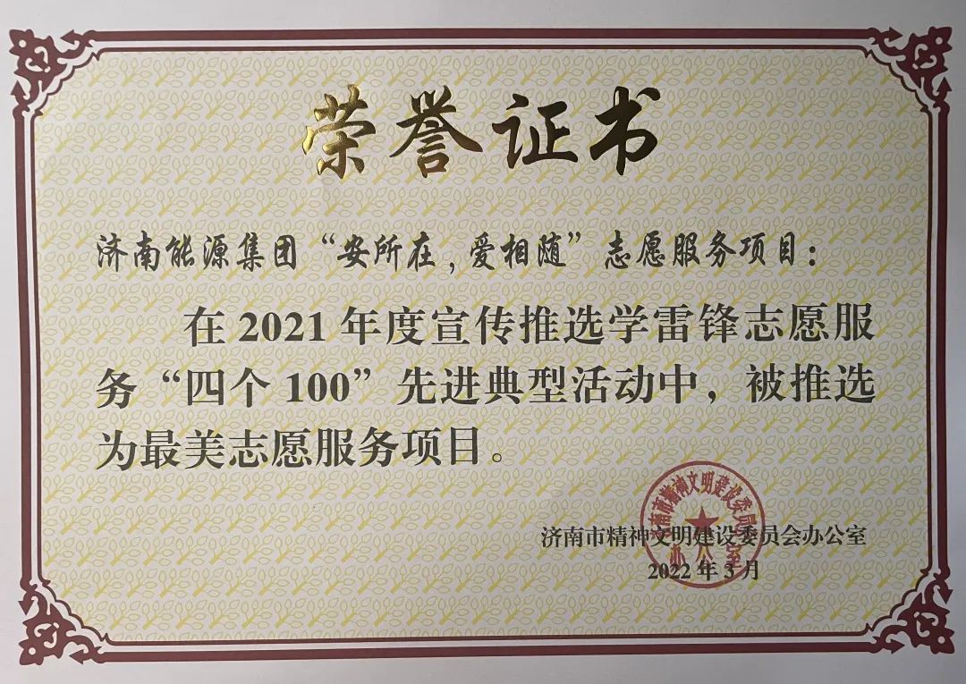 熱烈祝賀濟南能源集團所屬山東濟華燃氣“安所在,愛相隨”志愿服務項目和濟南港華燃氣“走進無聲世界 共度端午佳節(jié)”項目在“2021 年度全市學雷鋒志愿服務 ‘四個 100’先進典型活動中榮獲最美志愿服務項目。
