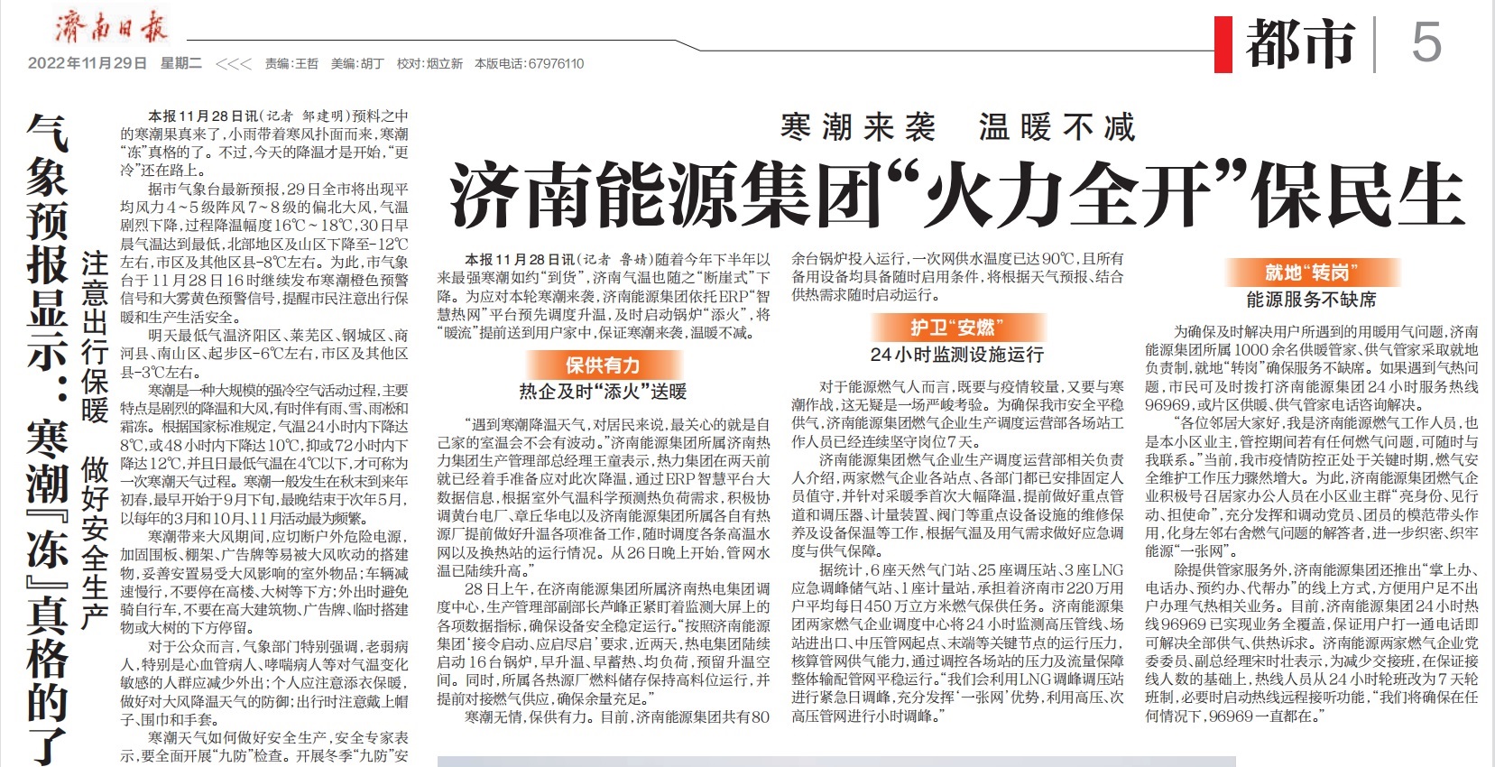 【濟(jì)南日報】寒潮來襲 溫暖不減 濟(jì)南能源集團(tuán)“火力全開”保民生