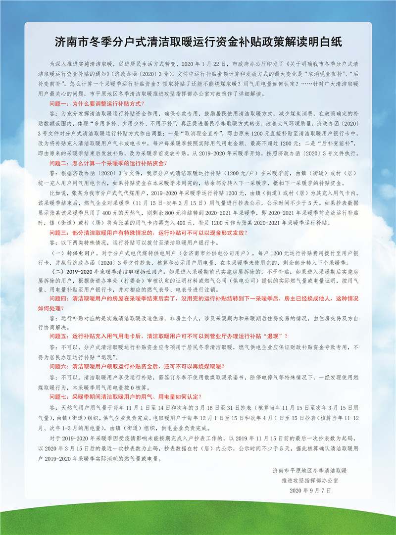 濟南市冬季分戶式清潔取暖運行資金補貼政策解讀明白紙